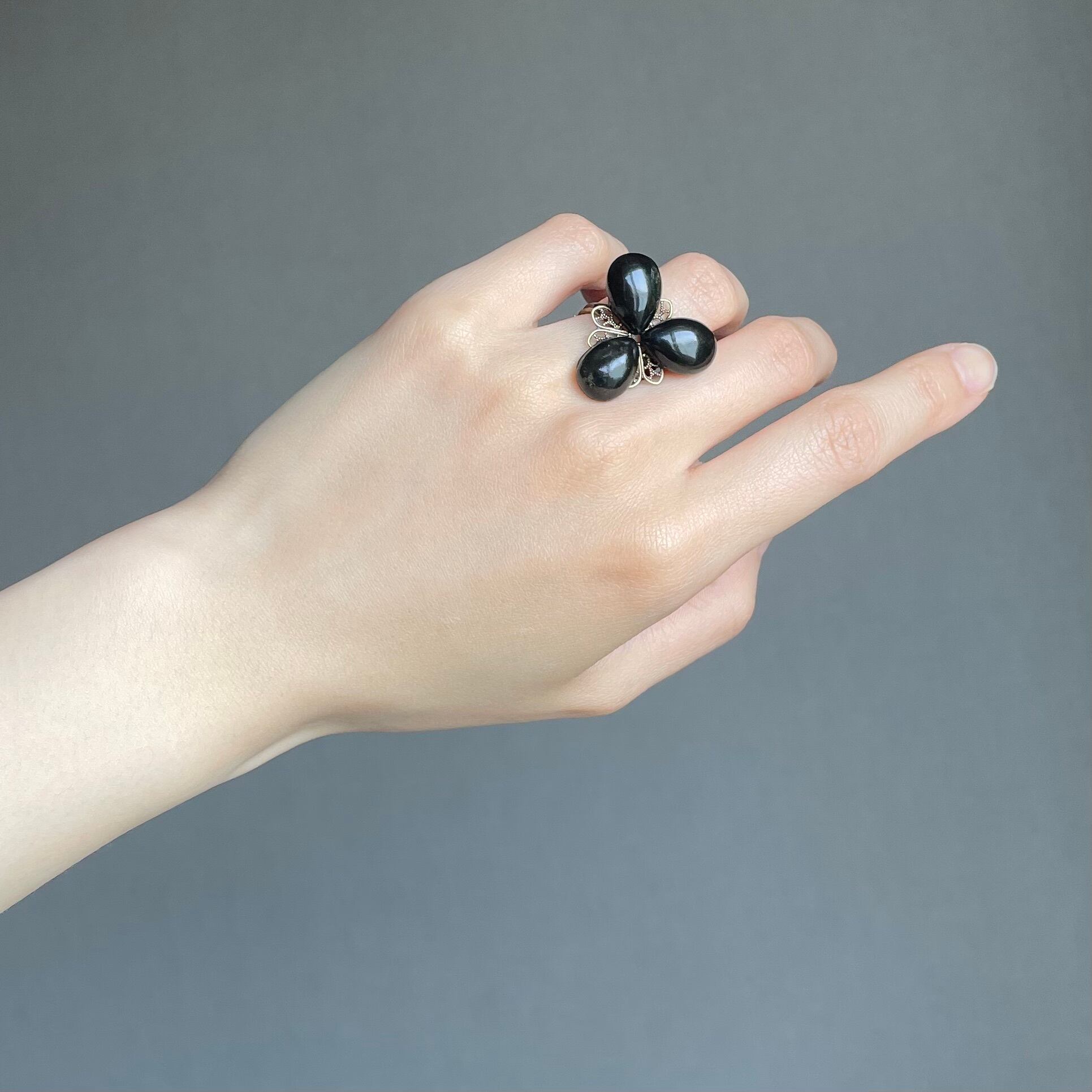 金古美スカシ花十弁台と三つの黒い雫の焼き物を組み合わした指輪。